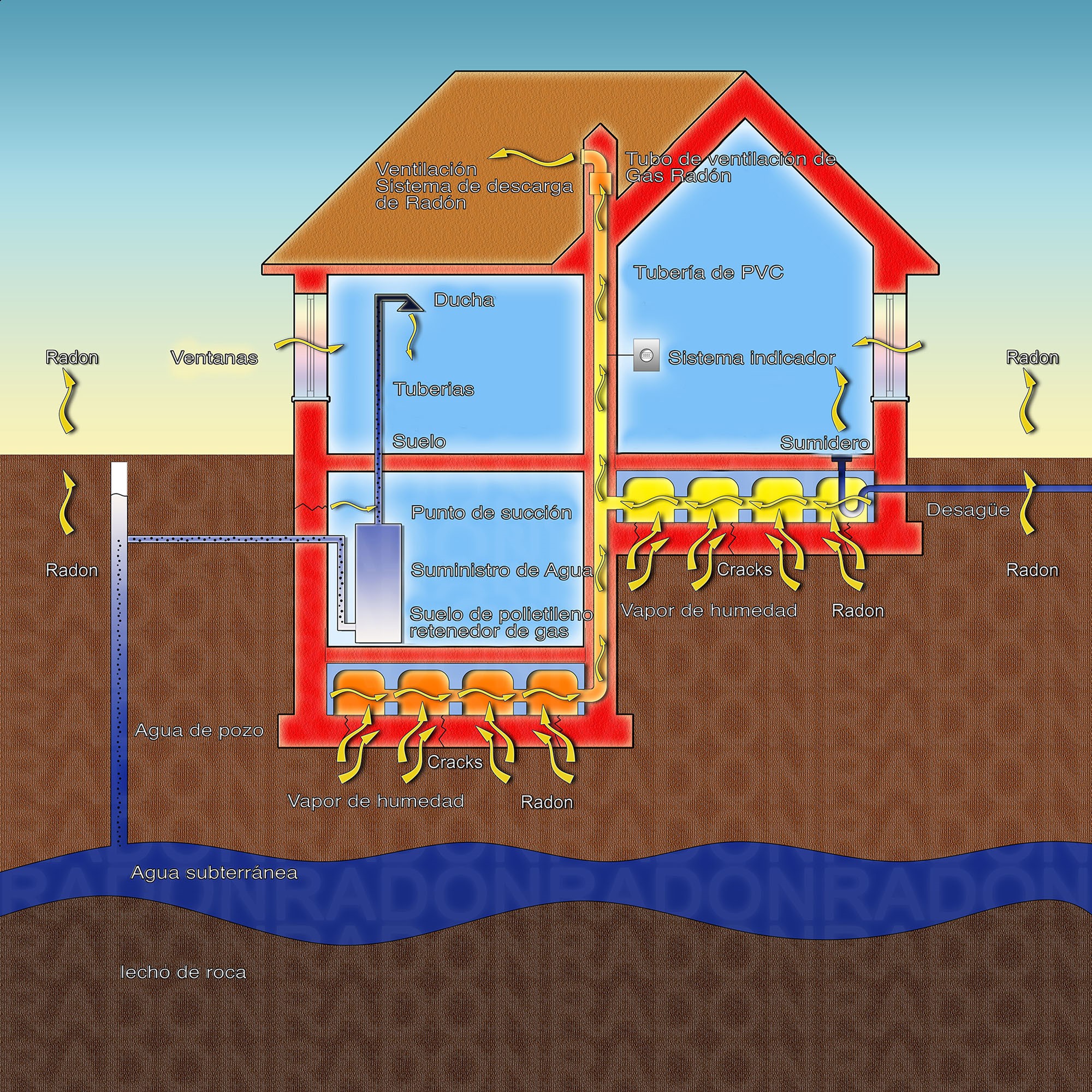 - Aislamiento del suelo: la entrada de radón en el interior de las edificaciones depende en gran medida de las características de construcción de los elementos de separación y aislamiento entre la edificación y el terreno sobre el que se asienta.